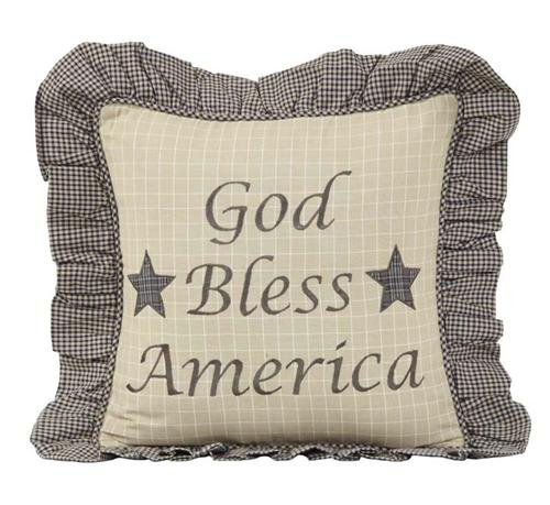 16" God Bless Pillow.Plaid and striped united states shades of pink, cream, tan, navy, black and gunmetal blue.100% cotton. America is our dazzling patriotic-Americana tribute to Old Glory. Plaid & striped usa colorations of purple, cream, tan, navy, black & gunmetal blue incorporate this masterpiece. Available in bedding, window treatments, & bathe curtains..